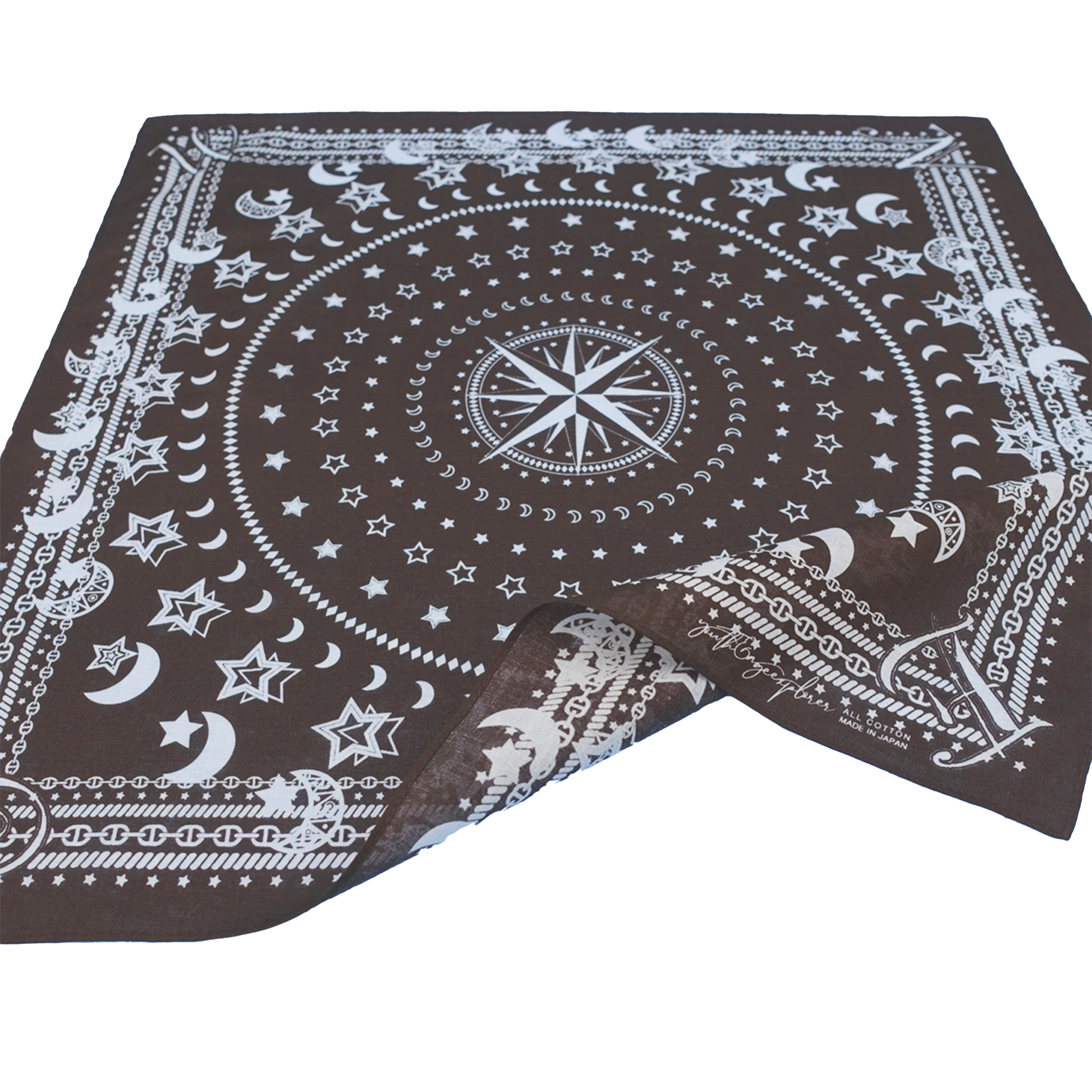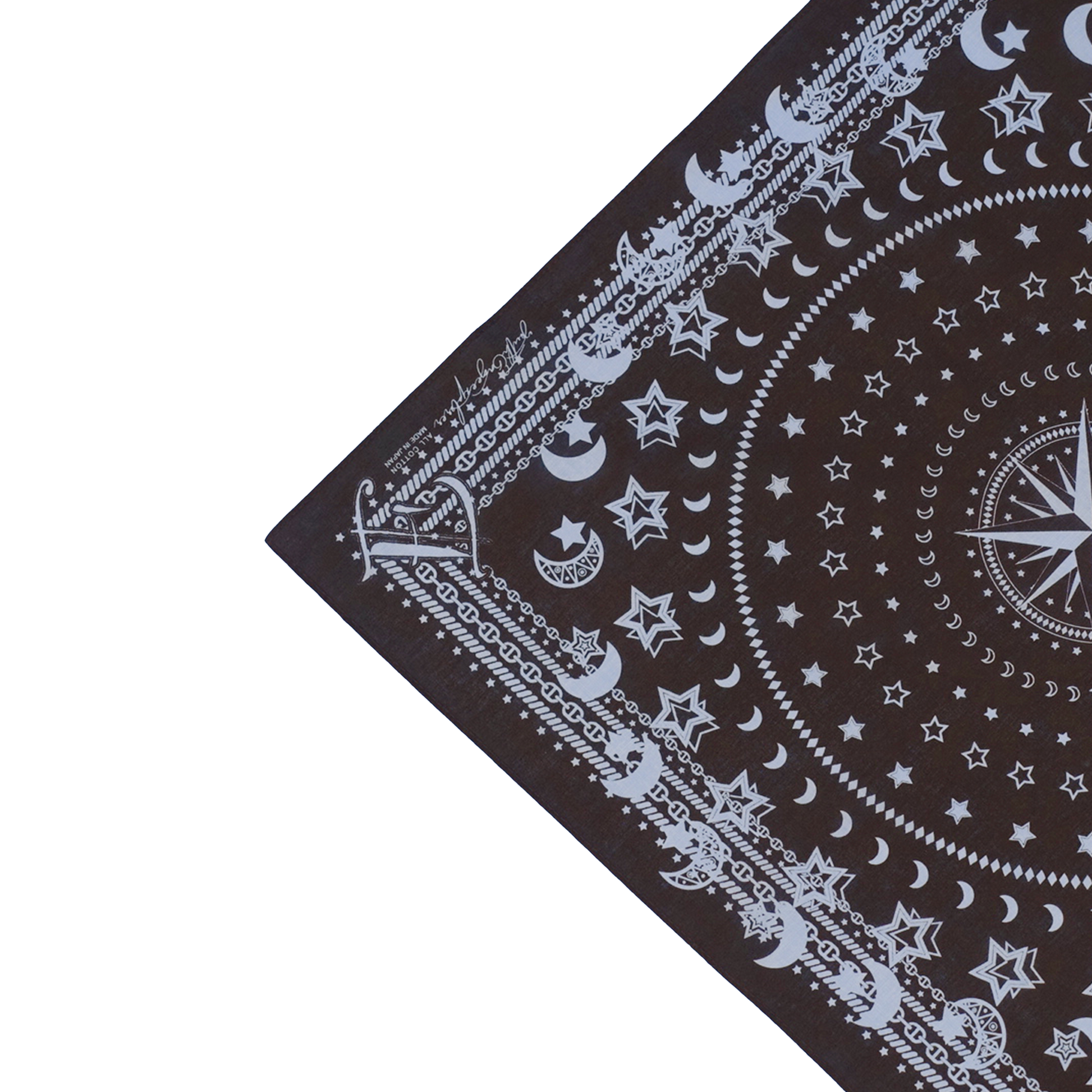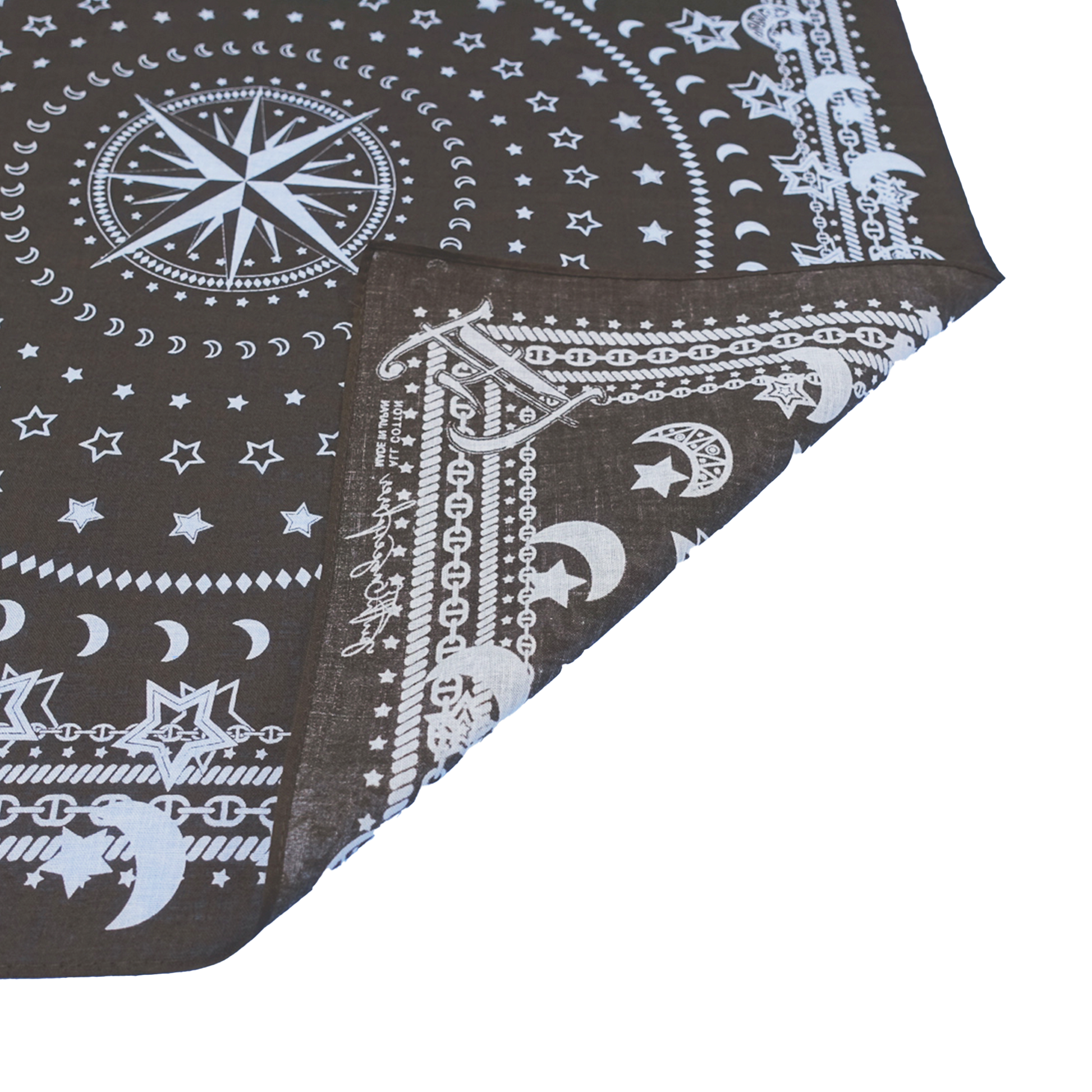 ブランドのシグネチャーの月と星、海や船にまつわるアンカーチェーン、ロープのモチーフでデザインされたバンダナです。